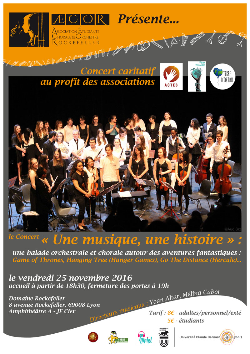 L'Association ?tudiante de la Chorale et Orchestre Rockefeller (AECOR) organise un concert caritatif au profit de trois associations étudiantes de l’Université Claude Bernard Lyon 1 : Actes, Pharma Lyon Humanitaire et Terre d'ortho.